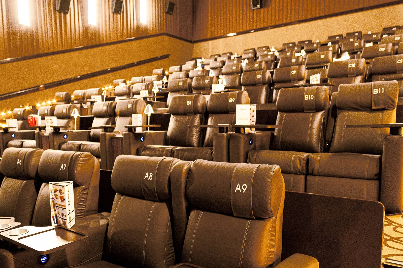 Os atendentes ficam na sala durante a exibição dos trailers, mas é possível chamá-lo apertando um botão, instalado em cada assento. Todas as poltronas dispõem de uma entrada USB, para quem precisa por algum motivo carregar o celular.