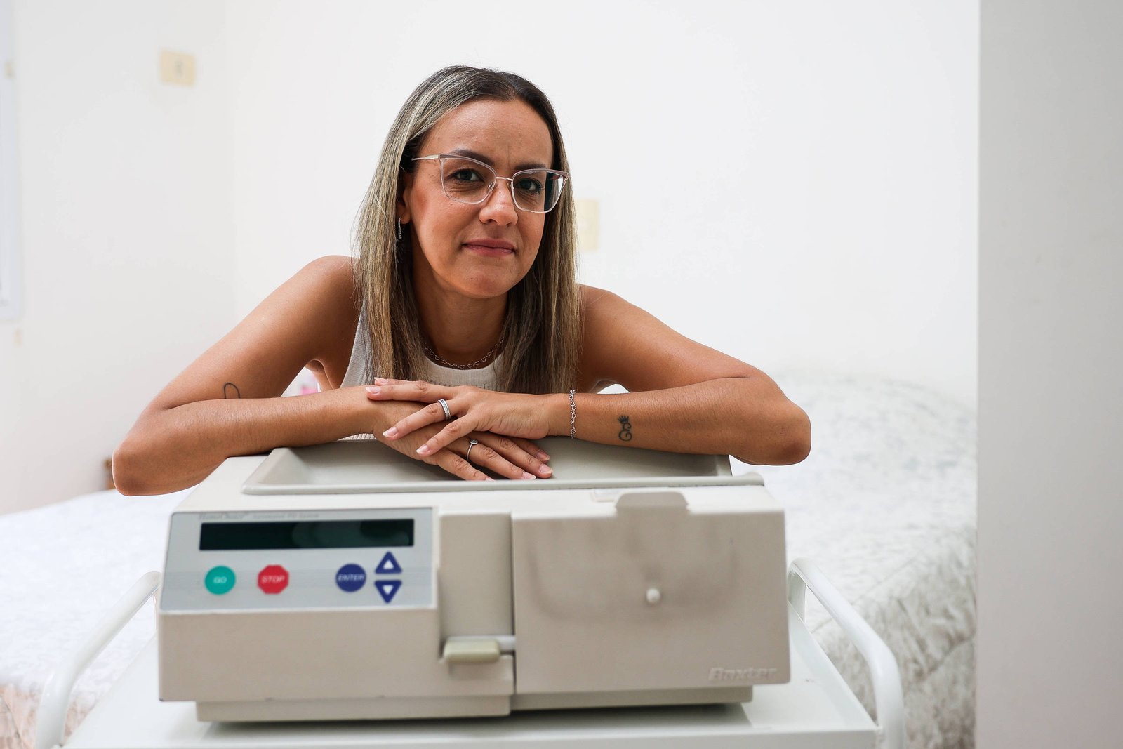 A professora Carolina Barbieri, 39, vive com doença renal crônica desde os 27 anos. Todas as noites, enquanto dorme, uma máquina filtra as impurezas que seus rins não conseguem mais eliminar pela urina, na diálise peritoneal. Já a aposentada Gleidiane Tavares, 41, percorre 1.440 km por semana para passar quatro horas no hospital conectada a um equipamento para a hemodiálise.