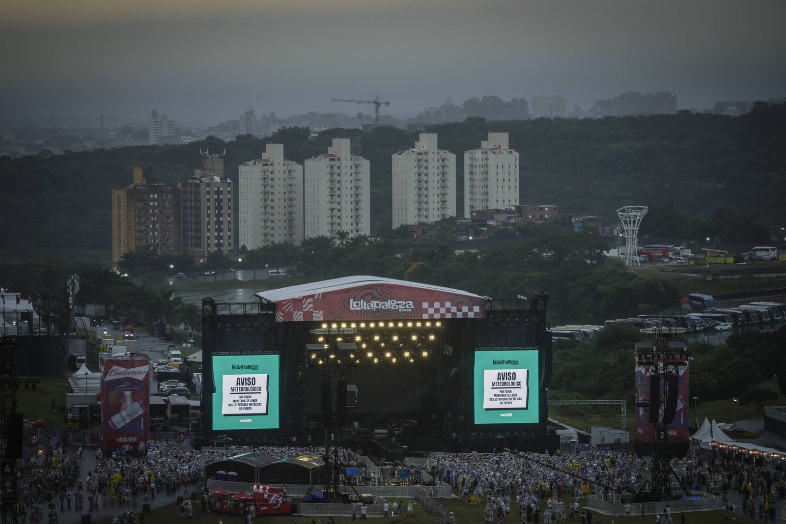 “O Lollapalooza é o primeiro festival do Brasil a elaborar um plano de evacuação e retorno do público para o caso de tempestades chuvas, raios ou ventos fortes”, diz o festival em nota. “A segurança e o bem-estar do público são nossa prioridade absoluta. Devido à probabilidade de raios, a organização do festival realizou uma pausa nos shows neste momento, que deve durar em torno de 30 a 40 minutos, e orienta o público a ir para as áreas de asfalto e manter-se longe de estruturas metálicas.”
