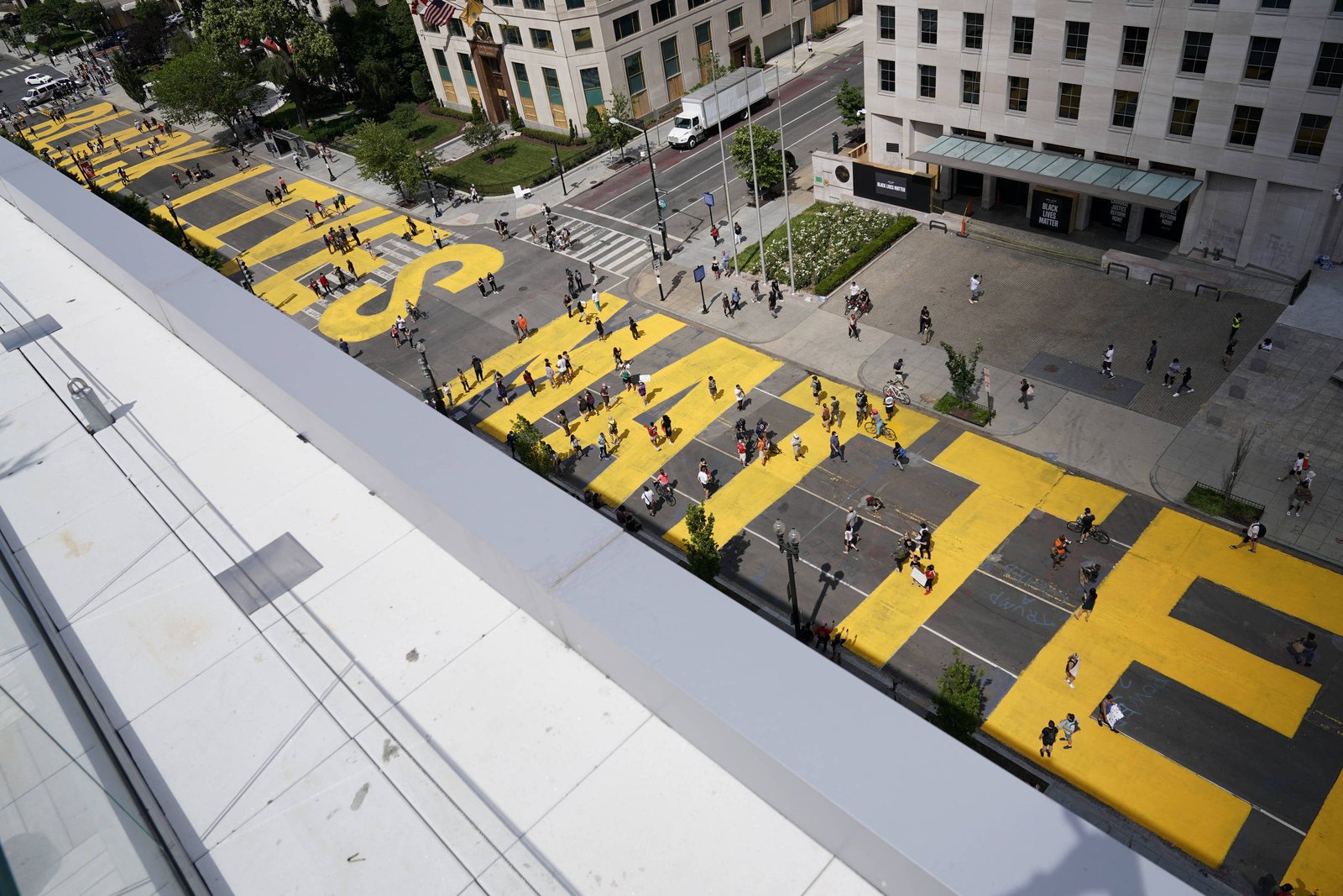 Diante de máquinas e do barulho de britadeiras, moradores e integrantes de movimentos sociais acompanham nesta semana a remoção do mural onde se lê a frase “Black Lives Matter” (vidas negras importam), marco antirracista traçado ao longo de uma rua próxima à Casa Branca, em Washington.