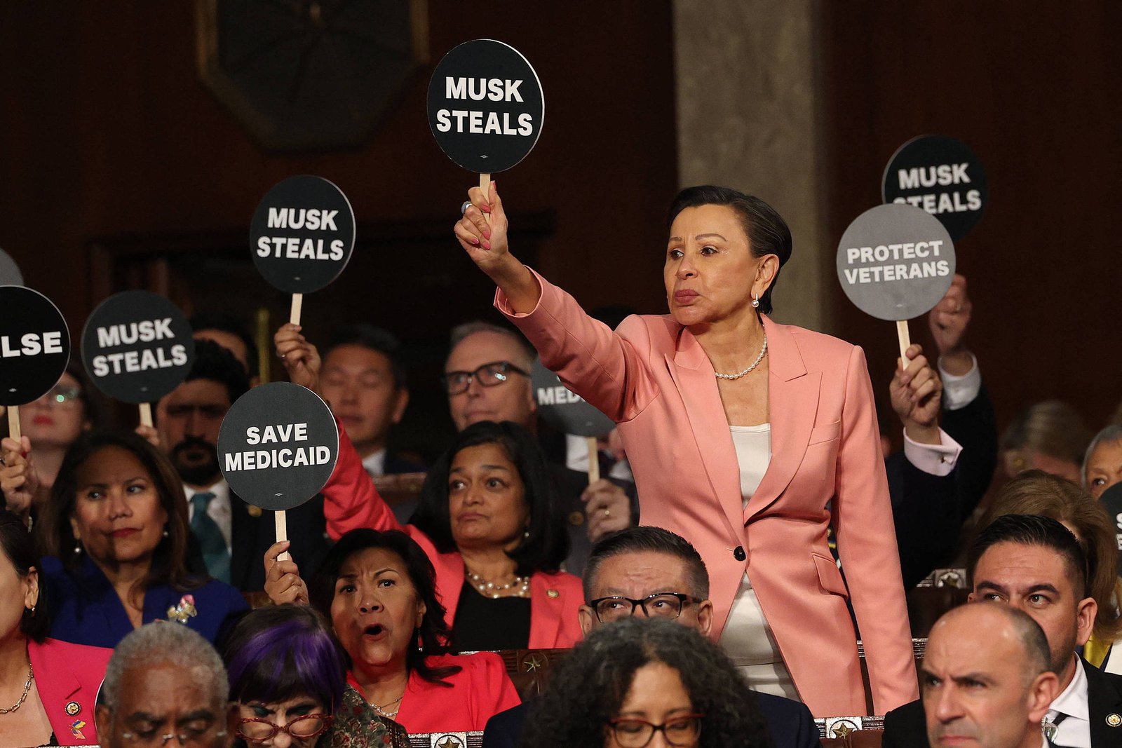 Não, foi o comportamento de muitos dos democratas na Câmara que realmente me fez estremecer. Muitos compareceram segurando cartazes com frases como “Isso é mentira”, “Musk rouba” e “Isso não é normal”, e os ergueram como estudantes em protestos em vários momentos do discurso de Trump.