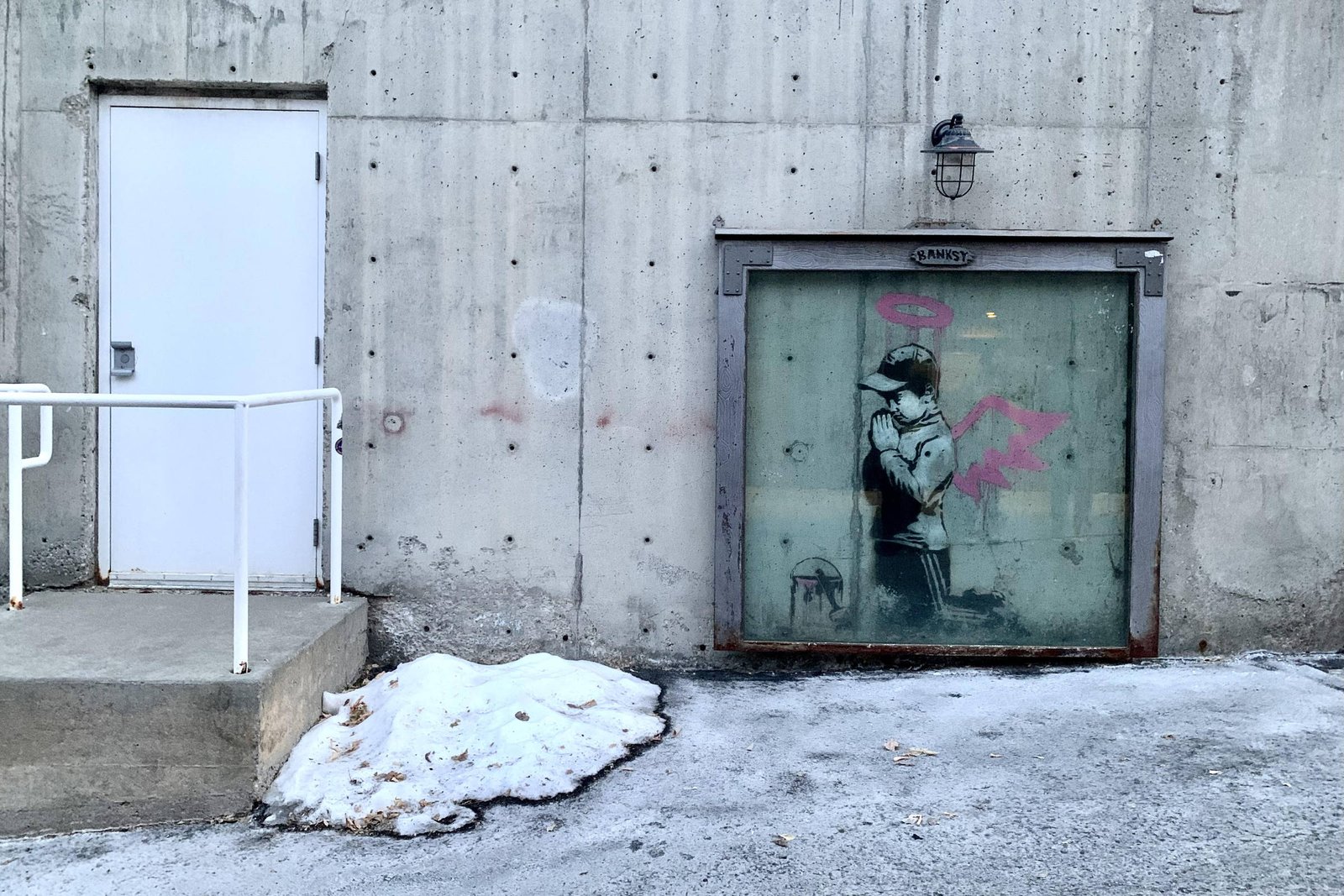 Já outro grafite, de um garoto com asas que está rezando, não teve a mesma sorte. Mesmo com uma capa protetora, o estêncil foi atacado em 2014 com tinta e, depois, restaurado. Hoje, tem um vidro de anteparo, mesmo arranjo que preserva o desenho, na parede de uma cafeteria, de um cinegrafista que filma uma flor.