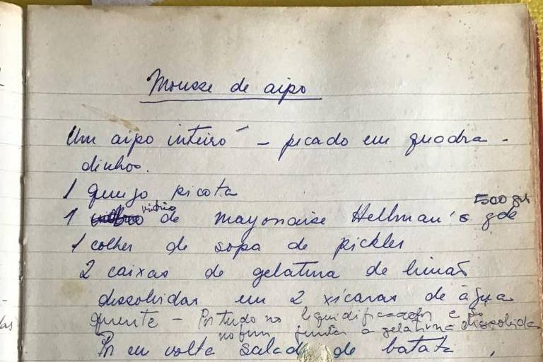 Ao examinar a receita em si, você perceberá que ela é um tanto peculiar. Segundo Eliana, a família apelidou a musse de Kolynos — alusão à marca de pasta de dente mais famosa naqueles tempos— devido ao sabor marcante do salsão cru. Picles, ricota, maionese e gelatina de limão completam a lista de ingredientes.